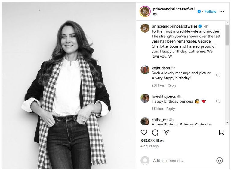 وكتب الأمير على الصفحة الرسمية للزوجين على الشبكات الاجتماعية: "إلى الزوجة والأم الرائعة. لقد كانت القوة التي أظهرتها على مدار العام الماضي رائعة. جورج، شارلوت، لويس وأنا فخورون بك للغاية. عيد ميلاد سعيد كاثرين، نحن نحبك".