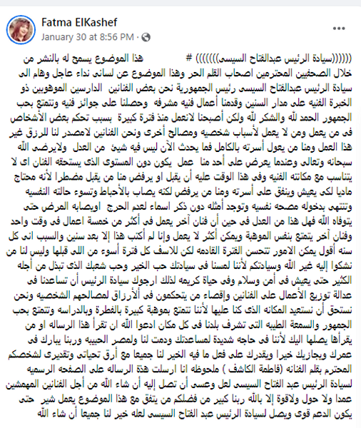 واختتمت قائلة: "ملحوظة.. أرسلت هذة الرسالة على الصفحه الرسمية لسيادة الرئيس عبدالفتاح السيسي لعل وعسى أن تصل إليه إن شاء الله من أجل الفنانين المهمشين عمدا ولا حول ولا قوة إلا بالله ربنا كبير.. من فضلكم من يتفق مع هذا الموضوع يعمل شير حتى يكون الدعم قويا ويصل لسيادة الرئيس لعله خيرا لنا جميعا إن شاء الله ".