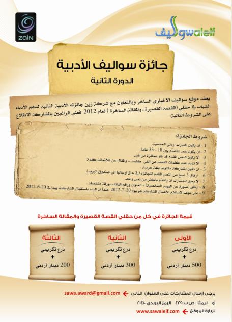 لجائزة سواليف الادبية الثانية التي يعقدها موقع سواليف الاخباري الساخر لدعم الأدباء