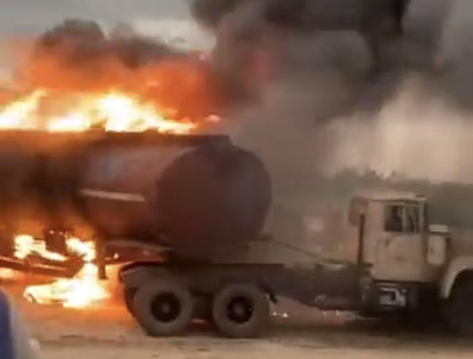 وسارع السائق الشجاع بقيادة شاحنة وقود مشتعلة إلى مكان آمن تجنبا لانفجارها في منطقة مزدحمة بالسكان.