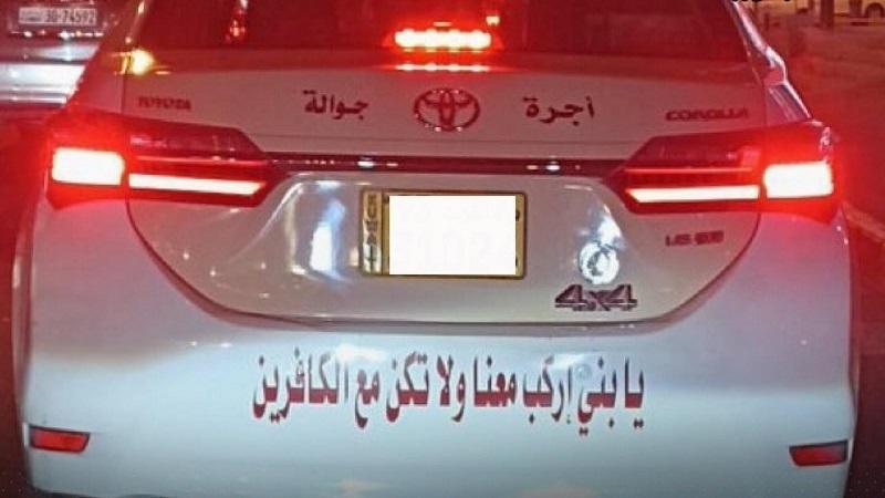 وكان نشطاء على مواقع التواصل الاجتماعي قد تداولوا صورة مركبة الأجرة التي كتب عليها قائدها جزء من آية قرآنية من سورة هود يقول: "يَا بُنَيَّ ارْكَب مَّعَنَا وَلاَ تَكُن مَّعَ الْكَافِرِينَ" كما وضع على السيارة بعض الملصقات الأخرى.