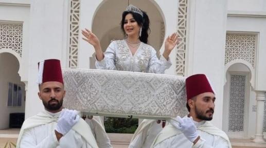 وشاركت لجين عمران في زفة العرس على الطريقة المغربية وهي تجلس داخل هودج محمولة على الأكتاف إلى القاعة الرئيسية