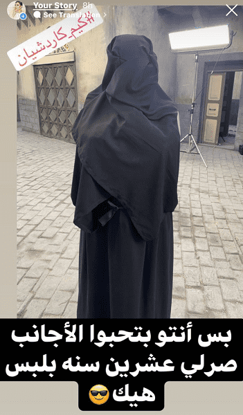 نشرت الممثلة السورية – الفلسطينية شكران_مرتجى صورة لها بدت فيها بالنقاب، وشبّهت نفسها بإطلالة كيم، وقالت: (بس انتو بتحبو كيم صرلي عشرين سنة بلبس هيك)