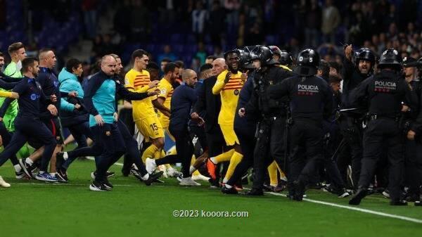 وعلى الفور، ركض لاعبو برشلونة تجاه غرفة خلع الملابس، هربا من جماهير الغريم الكتالوني التي اشتبكت مع قوات الأمن، وألقت المقاعد عليها.