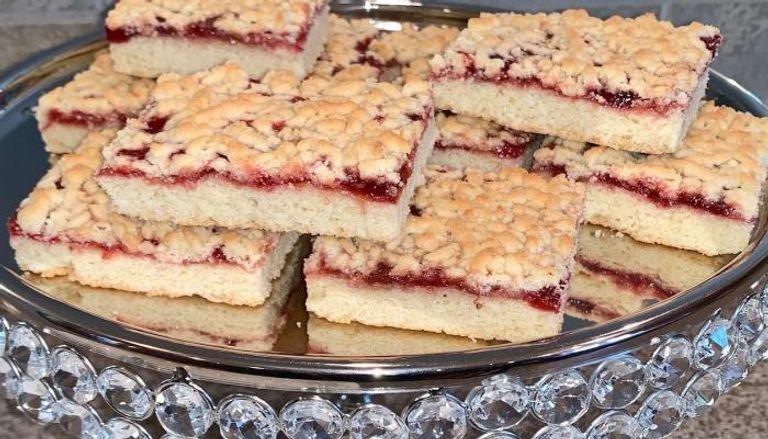 - يتم وضع طبقة من المربى على العجينة في الصينية، ويتم بشر العجينة المجمدة فوق الصينية.