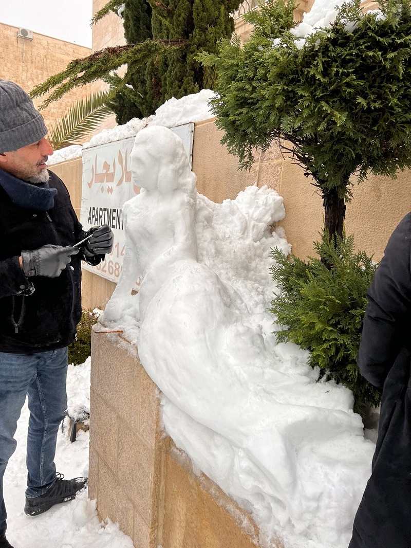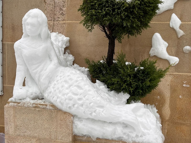 خبرني - استغل الفنان التشكيلي العراقي هاني دلة تساقط الثلوج على الأردن بحفره مجسما لـ "حورية البحر".