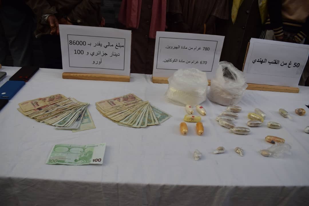وأردف البيان: "أسفرت العملية عن ضبط وحجز 780 غ من الهيرويين، 670غ من الكوكايين، 50غ من القنب الهندي، سيارتين ،13 هاتف نقال ،مبلغ مالي يقدر بـ 86000 دينار جزائري و 100 أورو. مواد صيدلانية ومعدات تستعمل في المزج التحضير للمخدرات".