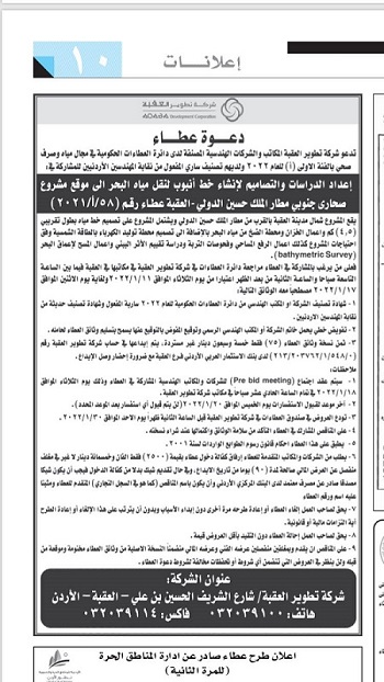 خبرني - دعت شركة تطوير العقبة المكاتب والشركات الهندسية المكاتب والشركات الهندسية المنصفة لدى دائرة العطاءات الحكومية في مجال مياه وصرف صحي بالفئة الأولى(أ) للعام 2022 ولديهم تصنيف ساري المفعول من نقابة المهندسين الأردنيين للمشاركة في إعداد الدراسات والتصاميم لإنشاء خط أنبوب لنقل مياه البحر إلى موقع مشروع صحارى جنوبي مطار الملك حسين الدولي - العقبة.