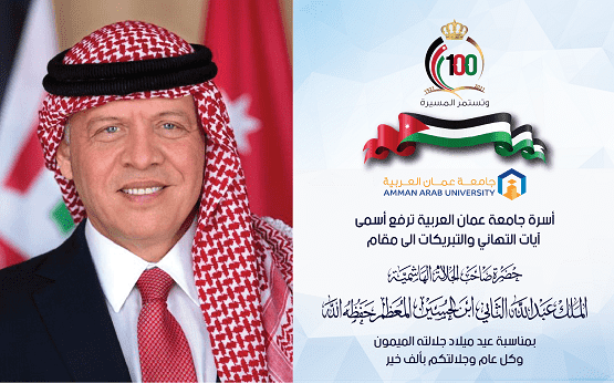خبرني - تتقدم أسرة جامعة عمان العربية بأسمى آيات التهنئة والتبريك لحضرة صاحب الجلالة الملك عبدالله الثاني ابن الحسين بعيد ميلاده الميمون متمنيين لجلالته موفورالصحة والعافية، ولبلدنا الغالي التطور والازدهار في ظل قيادة جلالته والأسرة الهاشمية الكريمة.