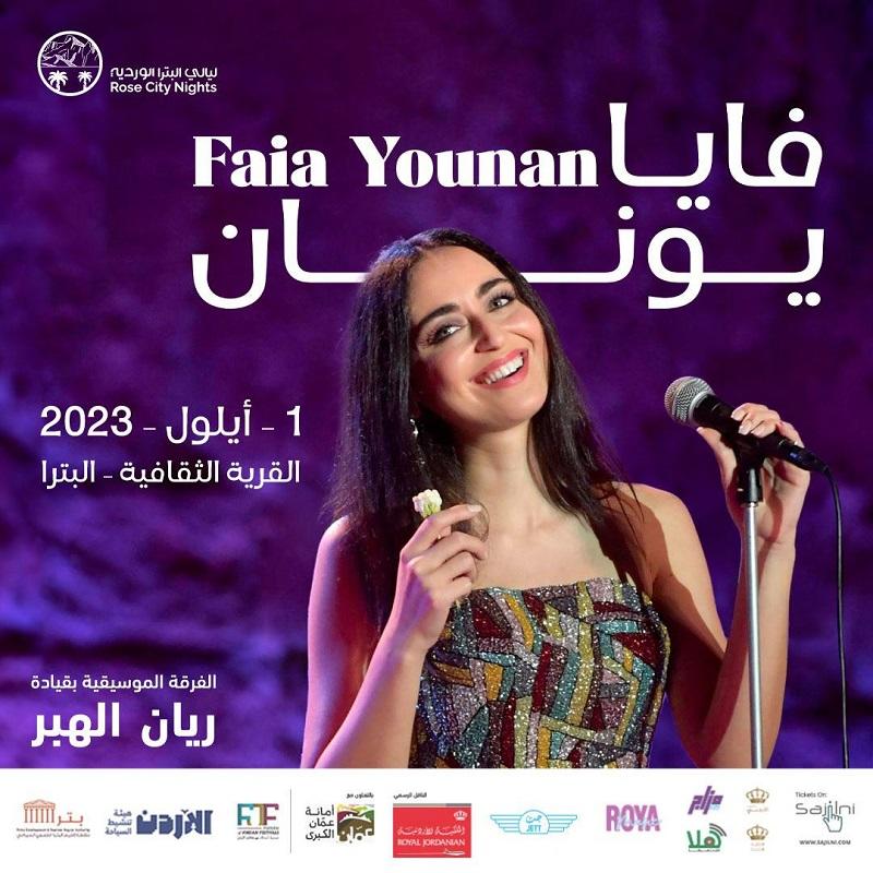 خبرني - ليالي البترا الوردية يقدم النجمة المحبوبة فايا يونان على مسرح القرية الثقافية - البترا في ١ ايلول ٢٠٢٣ بأمسية جديدة لتقدم اغاني البومها الجديد و مجموعة من أعمالها الشهيرة بقيادة الفنان ريان الهبر من لبنان ضمن برنامج عروض موسيقية تسعى لوضع الأردن على خارطة سياحة الترفيه العالمية عن طريق جذب عروض فنية وموسيقية عالمية المستوى للمملكة وخلق تجربة سياحية لا تنسى للجمهور من الاردنيين و جميع أنحاء العالم لتثبت الأردن كوجهة سياحية وثقافية واقتصادية عالمية المستوى ودعم المجتمعات المحلية وإنعاش الاقتصاد من خلال خلق فرص عمل في مواقع الفعاليات والمناطق المحيطة بها.