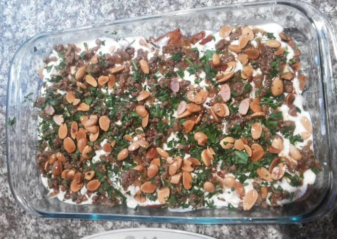 يُسكب خليط اللبن فوق المكدوس والخبز.
