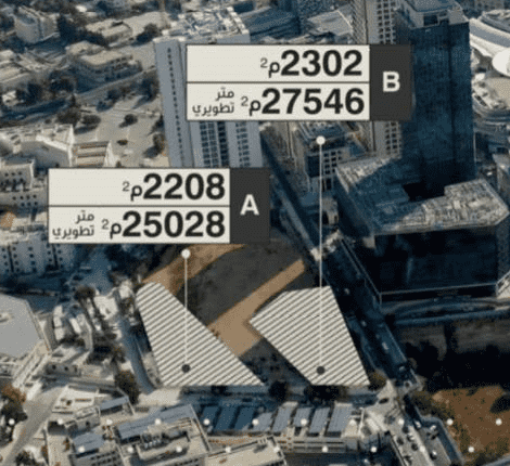 وحددت الشركة مساحتين الأولى 2302 مترا مربعا بمساحة تطوير ممكنة تبلغ 27546 مترا مربعا، والثانية 2208 أمتار مربعة، بمساحة تطويرية تبلغ 25028 مترا مربعا.