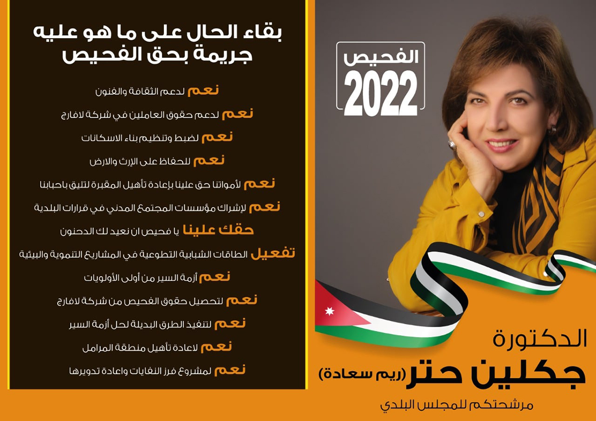 خبرني - أعلنت الفنانة الأردنية الدكتورة الفنانة جاكلين حتر (ريم سعادة) عن ترشحها لعضوية بلدية الفحيص.