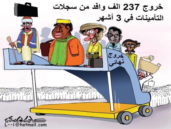 ويظهر الكاريكاتير عمالة وافدة من عدة جنسيات، وهم في أوضاع مآساوية، عند خروجهم بشكل نهائي من المملكة.