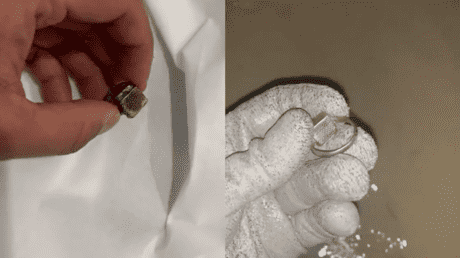 وظهر في لقطات الفيديو الرجل الكويتي وهو يفك الخاتم المكون من جزئين، حيث عثر على ورقة داخله محفوظة داخل غلاف من البلاستيك، ليفنحها ويجد مكتوب بداخلها كلام وأرقام بطريقة غريبة وغير مفهومة.