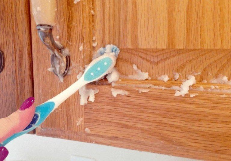 -بفرشاة أسنان ناعمة نستخدم المعجون السابق لفرك الخشب فى المطبخ بعد تركه على الخشب لمدة 10 دقائق.