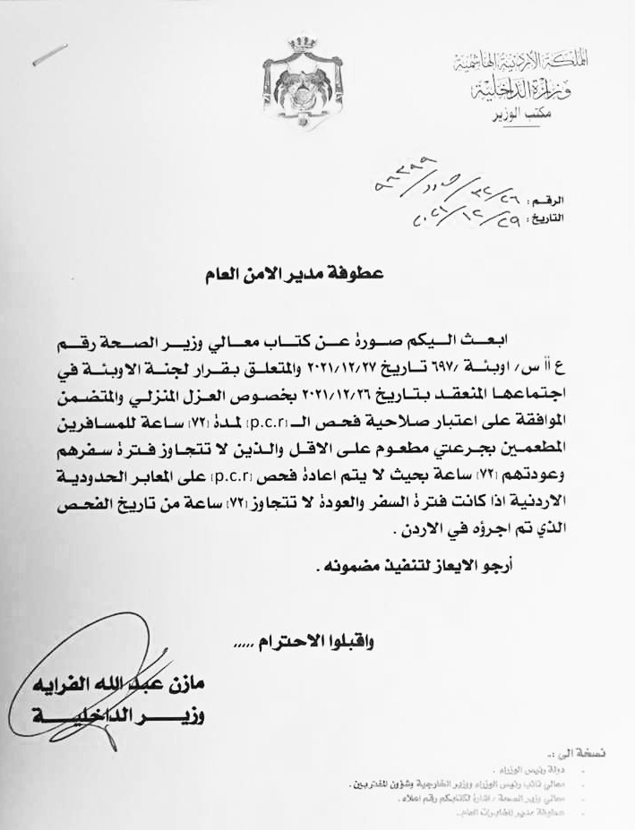 وجاء في كتاب صادر عن وزير الداخلية مازن الفراية الموافقة على اعتبار صلاحية فحص الـPCR لمدة 72 ساعة للمسافرين المطعمين بجرعتي مطعوم على الأقل والذين لا تتجاوز فترة سفرهم وعودتهم 72 ساعة، بحيث لا يتم إعادة فحص الـPCR على المعابر الحدودية الأردنية إذا كانت فترة السفر والعودة لا تتجاوز 72 ساعة من تاريخ الفحص الذي تم إجراؤه في الأردن.