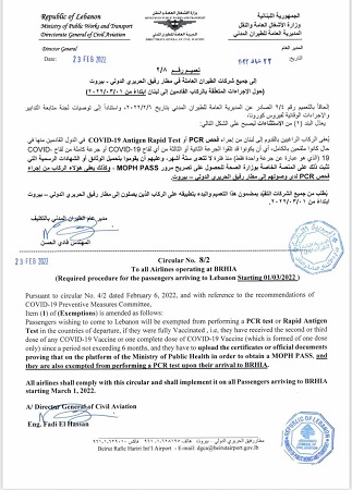 خبرني - عممت الحكومة اللبنانية إجراءات جديدة تتعلق بالركاب القادمين إليها سيجري العمل بها ابتداء من مطلع آذار المقبل.