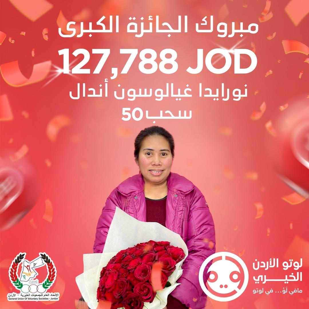 خبرني -  أعلن لوتو الأردن الخيري، وهو الشكل الإلكتروني الجديد لليانصيب الخيري الأردني، عبر منصاته على مواقع التواصل الاجتماعي "لوتو الأردن الخيري" عن هويّة الفائزة بأول جائزة كبرى في تاريخ الأردن، والتي بلغت قيمتها 127,788 ألف دينار أردني.