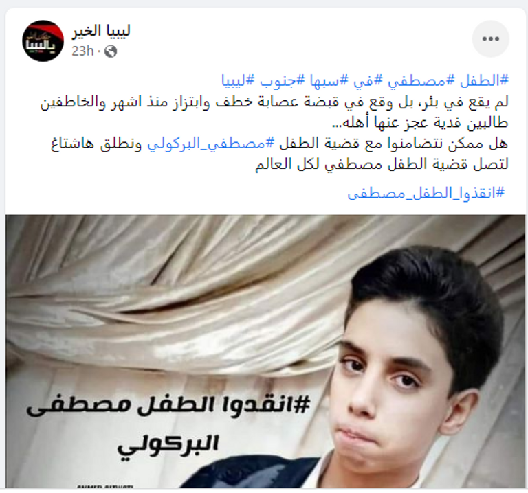 فقد أطلق نشطاء ليبيون على مواقع التواصل الاجتماعي وسم #أنقذوا_الطقل_مصطفى البركولي، المختطف في سبها.