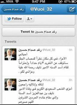 وسائل إعلام سعودية نقلت تعزية رغد صدام حسين بوفاة الأمير نايف من خلال صفحة على موقع