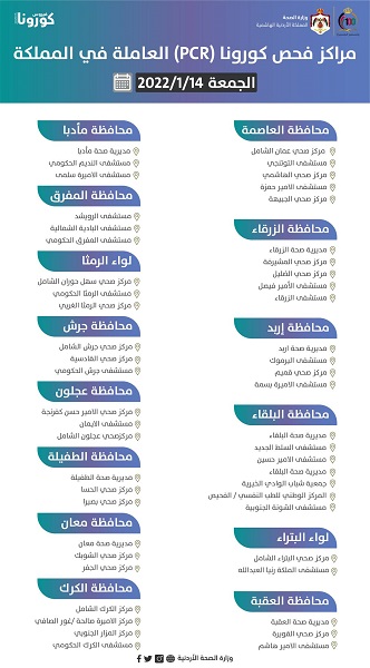 خبرني - أعلنت وزارة الصحة أسماء مراكز فحص كورونا (PCR) العاملة يوم الجمعة الموافق 2022/1/14.