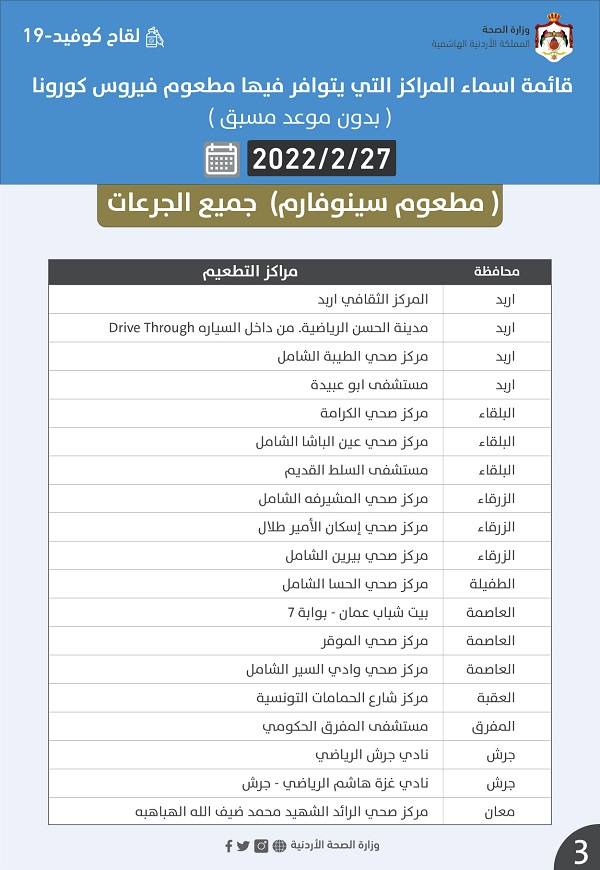 خبرني - أعلنت وزارة الصحة، مساء السبت، عن قائمة أسماء المراكز التي يتوافر فيها مطعوم فيروس كورونا (بدون موعد مسبق) وبجميع الجرعات ليوم غدا الأحد.