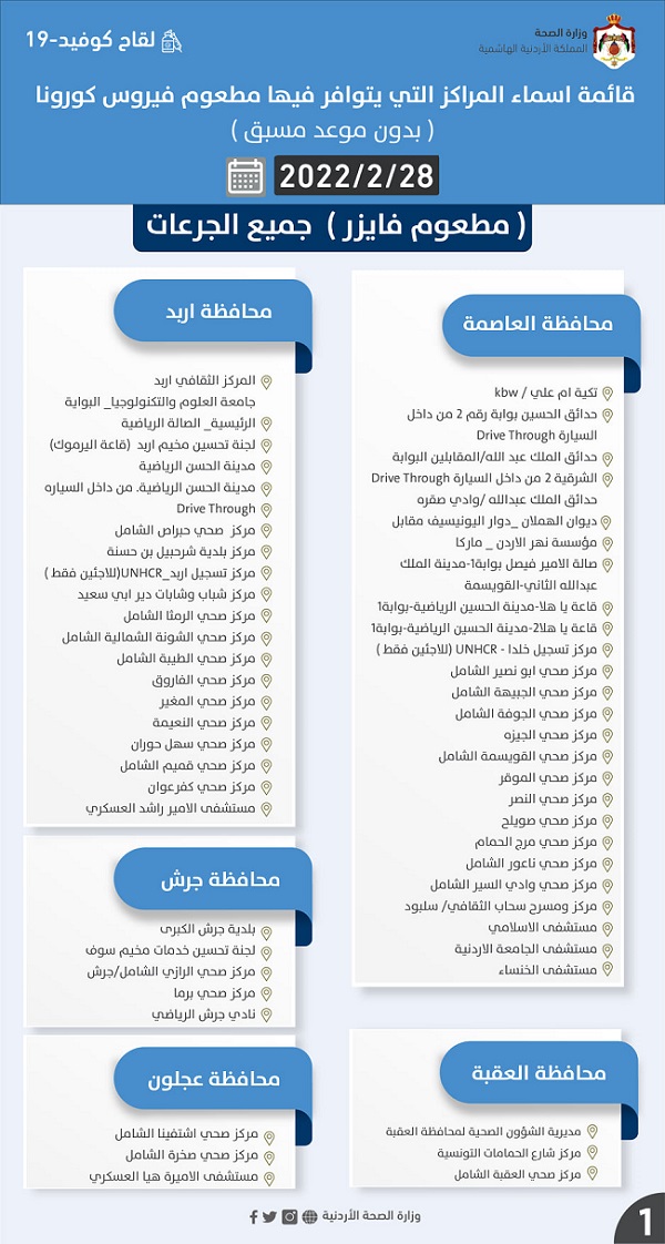 خبرني - أعلنت وزارة الصحة، مساء الأحد، قائمة أسماء المراكز التي يتوافر فيها مطعوم فيروس كورونا، وبجميع الجرعات ليوم غدا الاثنين.