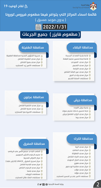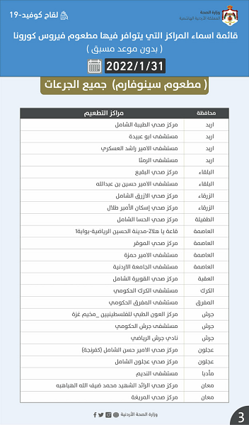 وفي منشور عبر “فيسبوك”، قالت إن المطاعيم المتوفرة هي “فايزر” و”سينوفارم”، منوهة بأن دوام مراكز المطاعيم ومراكز فحص كورونا من الساعة 8:00 صباحًا – 3:00 مساءً.