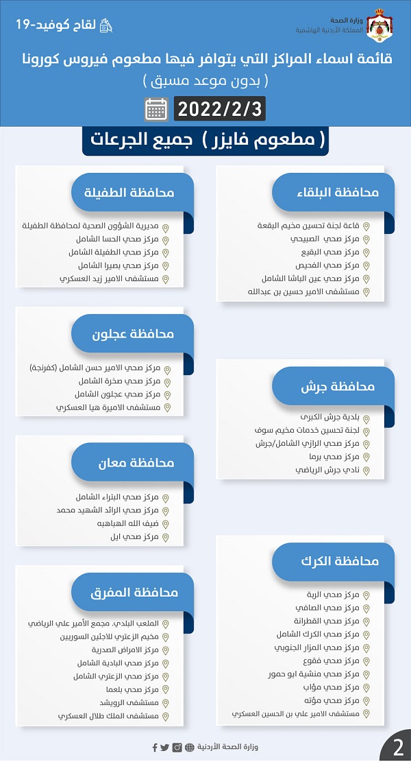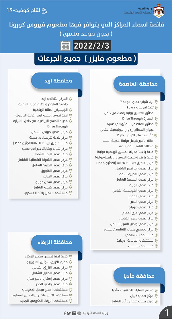 وفي منشور عبر "فيسبوك"، قالت إن المطاعيم المتوفرة هي "فايزر" و"سينوفارم"، منوهة بأن دوام مراكز المطاعيم ومراكز فحص كورونا من الساعة 8:00 صباحًا – 3:00 مساءً.