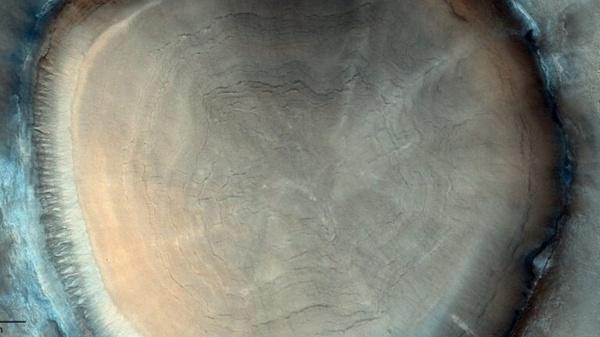 خبرني - التقط مسبار المريخ الروسي الأوروبي (TGO) مؤخرا صورة لحفرة دائرية غريبة على سطح الكوكب الأحمر، تشبه إلى حد كبير جذع شجرة عملاق والدوائر التي تحدد عمر الشجر متحدة المركز.
