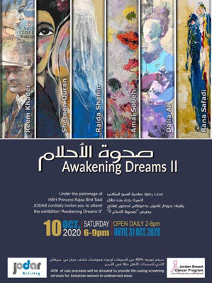 خبرني - يقيم جاليري جودار معرضاً يوم الثلاثاء فنياً لمجموعة من الفنانات ضمن معرض صحوة الأحلام في نسخته الثانية، وذلك تحت رعاية اﻷميرة رجاء بنت طلال، لدعم البرنامج الأردني لسرطان الثدي.