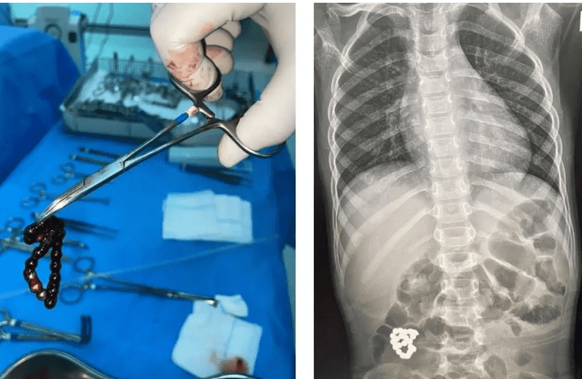 كما أضافت "أن الطفل حضر إلى طوارئ المستشفى يشتكي من آلام في البطن منذ 4 أيام، ازدادت مع الوقت، لتظهر صور الأشعة لاحقا وجود جسم غريب في أمعائه. وعلى الفور أدخل الصغير غرفة العمليات واستخرج الجسم الغريب، لافتة إلى أن جدار الأمعاء تضرر، لكنه الأطباء استأصلوا الأجزاء المتضررة بنجاح".