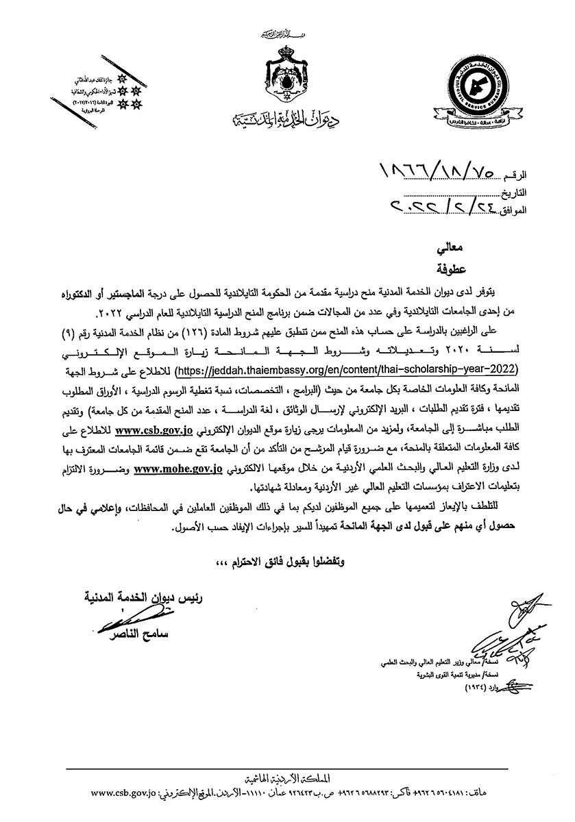 خبرني - اعلن ديوان الخدمة المدنية ، عن توفر منح دراسية مقدمة من الحكومة التايلاندية للحصول على درجة الماجستير أو الدكتوراه وفي عدد من المجالات للعام الدراسي 2022.
