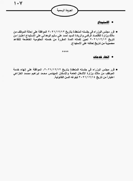 خبرني - صدر في عدد الجريدة الرسمية ، الاحد، قرارات مجلس الوزراء بإحالة موظفين حكوميين الى التقاعد.