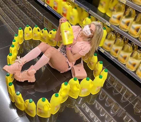 وظهرت ميريام كلينك في احد هذه الصورـ التي نشرتها عبر حسابها على انستغرام، هي تجلس على الارض وحولها العشرات من غالونات الزيت.