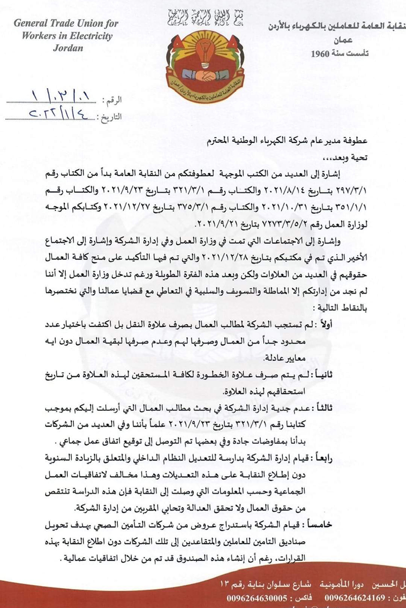 وبين الكتاب، "أن إدارة الشركة تدير ظهرها لمطالب العمال"، مشيرا إلى أن النقابة ستعلن عن إضراب مفتوح في حال عدم التجاوب وحسب القانون.