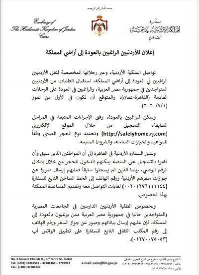 خبرني – أعلنت السفارة الأردنية في مصر بدء عملية الحجز على رحلات المرحلة الرابعة للأردنيين الراغبين بالعودة إلى المملكة، ممن سجلوا في المراحل السابقة.