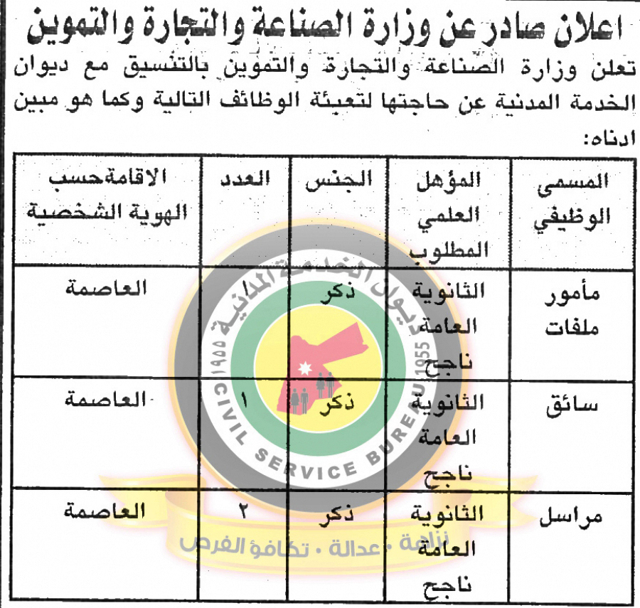 خبرني - اعلنت وزارة الصناعة بالتنسيق مع ديوان الخدمة ، عن توفر وظائف شاغرة ، وفقا للتفايل والشروط المرفقة: