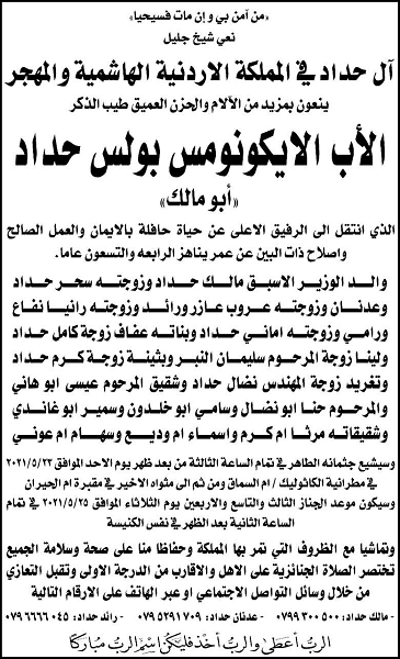 خبرني - ينعى آل حداد في المملكة الاردنية الهاشمية والمهجر بمزيد من الآلام والحزن العميق طيب الذكر الاب الايكونومس بولس حداد "ابو مالك"