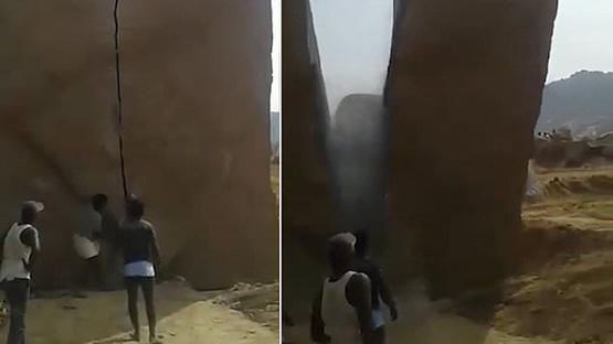 خبرني - لحظة مثيرة ومدهشة سجلتها كاميرا هاتف ذكي لمجموعة من الرجال تمكنوا من فلق كتلة صخرية عملاقة يزيد ارتفاعها على 12 مترا.
