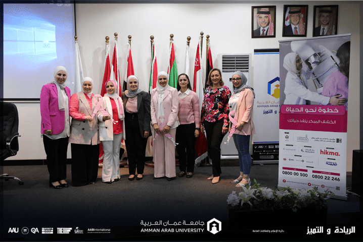 خبرني - انطلاقاً من المسؤولية المجتمعية لجامعة عمان العربية نظمت كلية الصيدلة وبالتعاون مع المركز الصحي في الجامعة والبرنامج الأردني لسرطان الثدي التابع لمؤسسة الحسين للسرطان، يوماً توعوياً بسرطان الثدي تحت عنوان (خطوة نحو الحياة...افحصي).