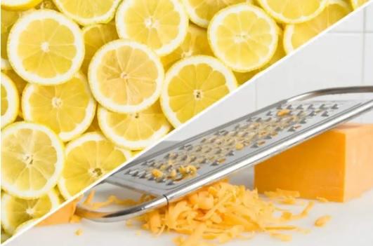 تنظيف المبشرة بالليمون: قومي بتغميس قطعة من الليمون بالملح، وافركي المبشرة بالليمون. واتركيها تنقع لمدة 5 دقائق. ثم اشطفي المبشرة بالماء الساخن لضمان إزالة بقايا الطعام. وعصير الليمون. والملح المتبقي.