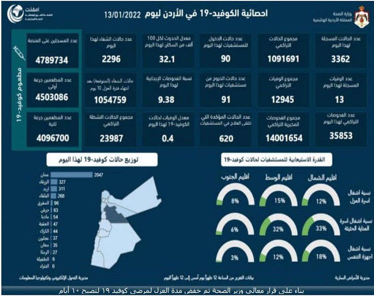 3362 اصابة و13 وفاة بكورونا فيما بلغت النسب الايجابية للفحوصات 9.38 %