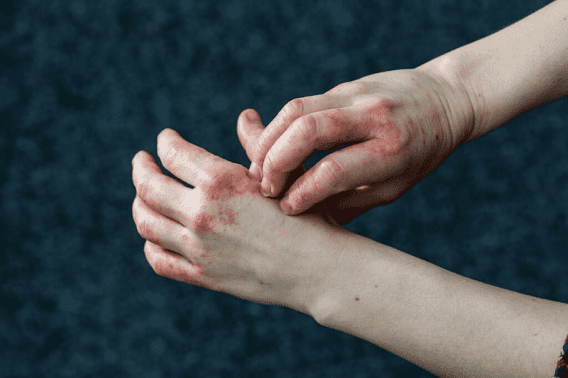قد يكون الجلد المتأثر أحمراً شديد الحكة، متورماً، أو جافاً ومتقرحاً.