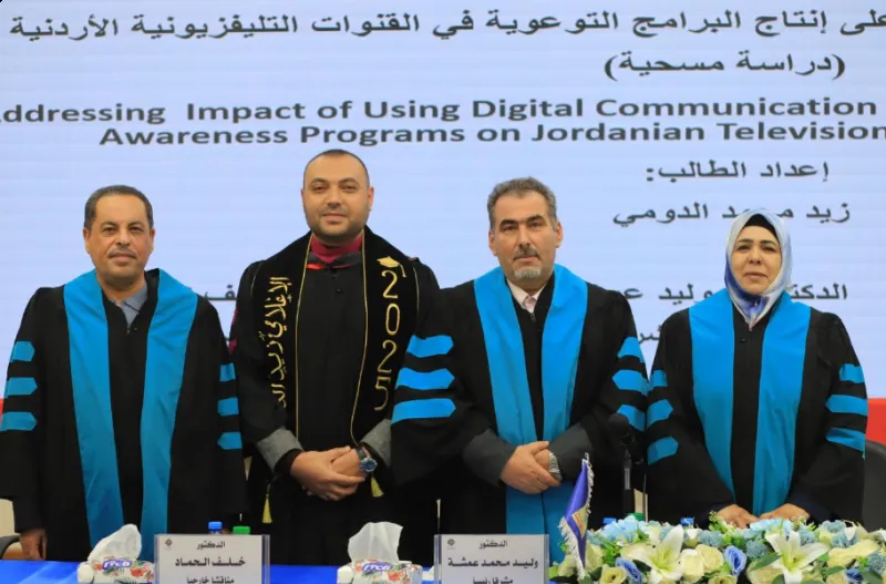 خبرني - يتقدم الاهل والأصدقاء بأسمى آيات التهنئة والتبريكات من الاستاذ زيد الدومي بمناسبة حصولة على درجة الماجستير في الاعلام من جامعة جدارا . وذلك بعد مناقشة رسالته التي جاءت تحت عنوان : "تأثير استخدام تقنيات الاتصال الرقمي على إنتاج البرامج التوعوية في القنوات التليفزيونية الأردنية و بإشراف الدكتور وليد عمشة