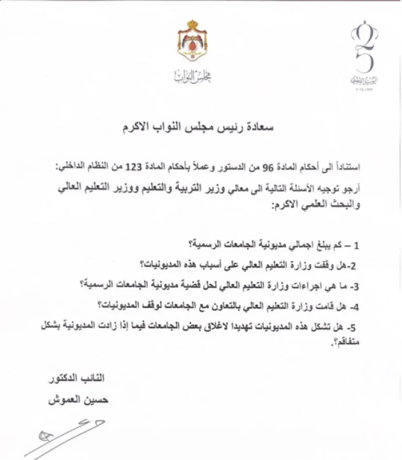 خبرني - وجه النائب الدكتور حسين العموش سؤالًا نيابيًا إلى رئيس مجلس النواب، موجهًا إلى وزير التربية والتعليم والتعليم العالي، حول مديونية الجامعات الرسمية والإجراءات المتخذة لمعالجتها.