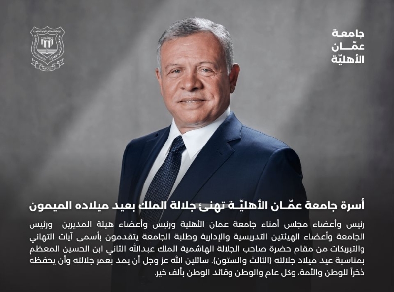خبرني - رئيس وأعضاء مجلس أمناء جامعة عمان الأهلية ورئيس وأعضاء هيئة المديرين ورئيس الجامعة وأعضاء الهيئتين التدريسية والإدارية وطلبة الجامعة يتقدمون بأسمى آيات التهاني والتبريكات من مقام حضرة صاحب الجلالة الهاشمية الملك عبدالله الثاني ابن الحسين المعظم بمناسبة عيد ميلاد جلالته (الثالث والستون).