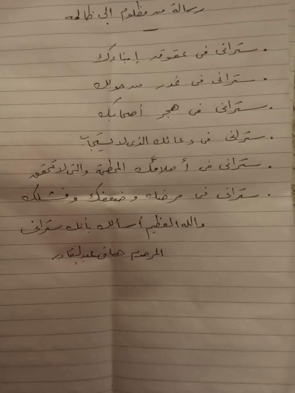 وترك الموظف المنتحر رسالة غامضة انتشرت على مواقع التواصل، جاء فيها "رسالة من مظلوم إلى ظالمه.. ستراني في عقوق أبناءك.. ستراني في غدر من حولك.. ستراني في هجر أصحابك.. ستراني في دعائك الذي لا يستجاب.. ستراني في أحلامك المحطمة والتي لا تتحقق.. ستراني في مرضك وضعفك وفشلك".