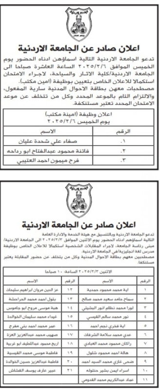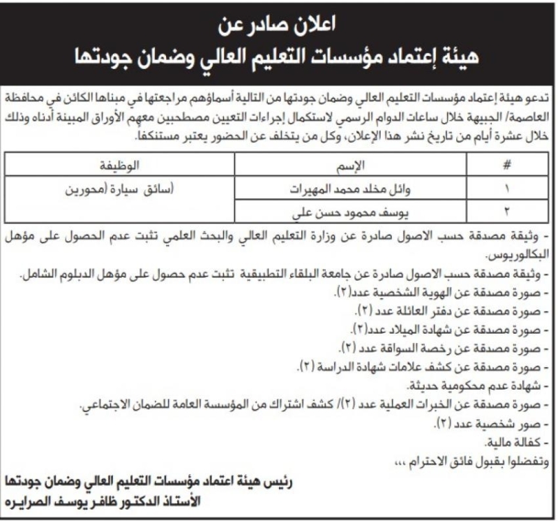 خبرني - أعلنت عدد من المؤسسات الرسمية ،اليوم الأحد، عن توفر شواغر لديها، وأخرى دعت مرشحين لاجراء المقابلات الشخصية لغاية استكمال اجراءات التعيين. وتاليا التفاصيل والأسماء عبر موقعنا: